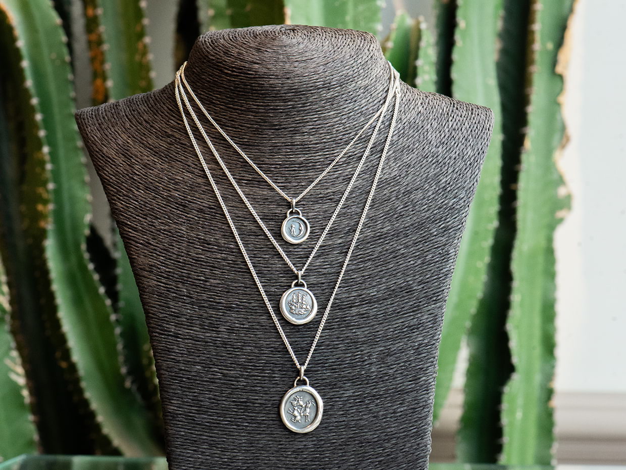Each one of our Amulet necklaces begins with our seal engravers hand carving a signet ring or metal stamp. This acts as our die, a stamp that creates the wax that is then cast into your Amulet.