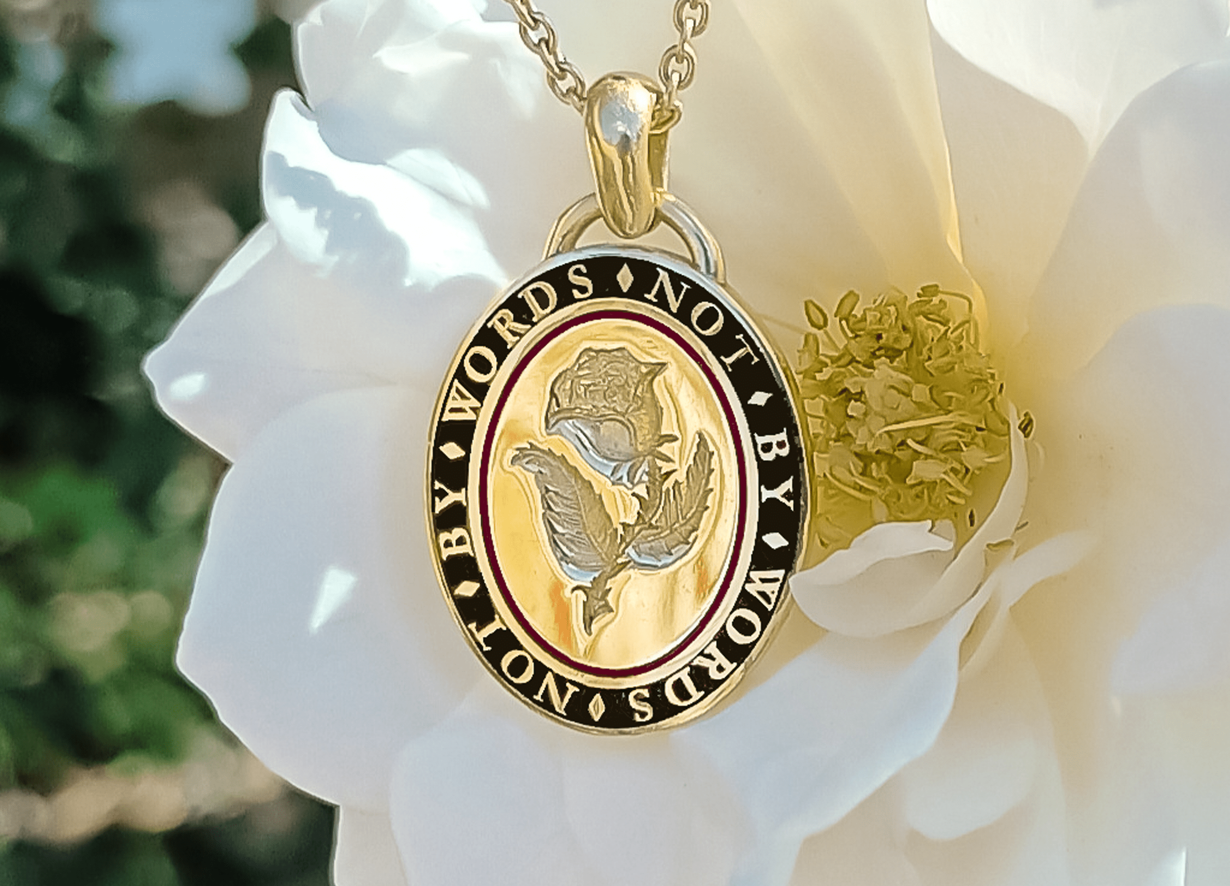 The 18ct yellow gold pendant, which hangs on a 24 inch chain, features a seal engraved rose at its centre, surrounded by a band of red vitreous enamel. Either side of the flower, the Latin motto shines through on black vitreous enamel.