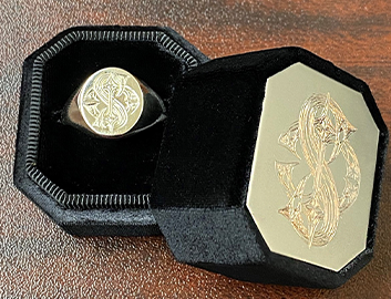 With a background in design, Eric set about creating a monogram that intertwined both their last initials, D & S, and choose the Latin translation “love beyond the veil of death” for an internal inscription. For maximum impact, he would later commission an accompanying ring box with the same engraving from The Mrs. Box.