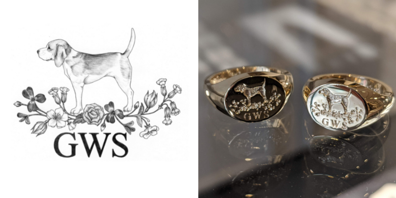 Working together with Rebus, they designed a ring that featured their beloved first dog Mabel standing over a bed of flowers - representing where they both come from - and their combined initials.