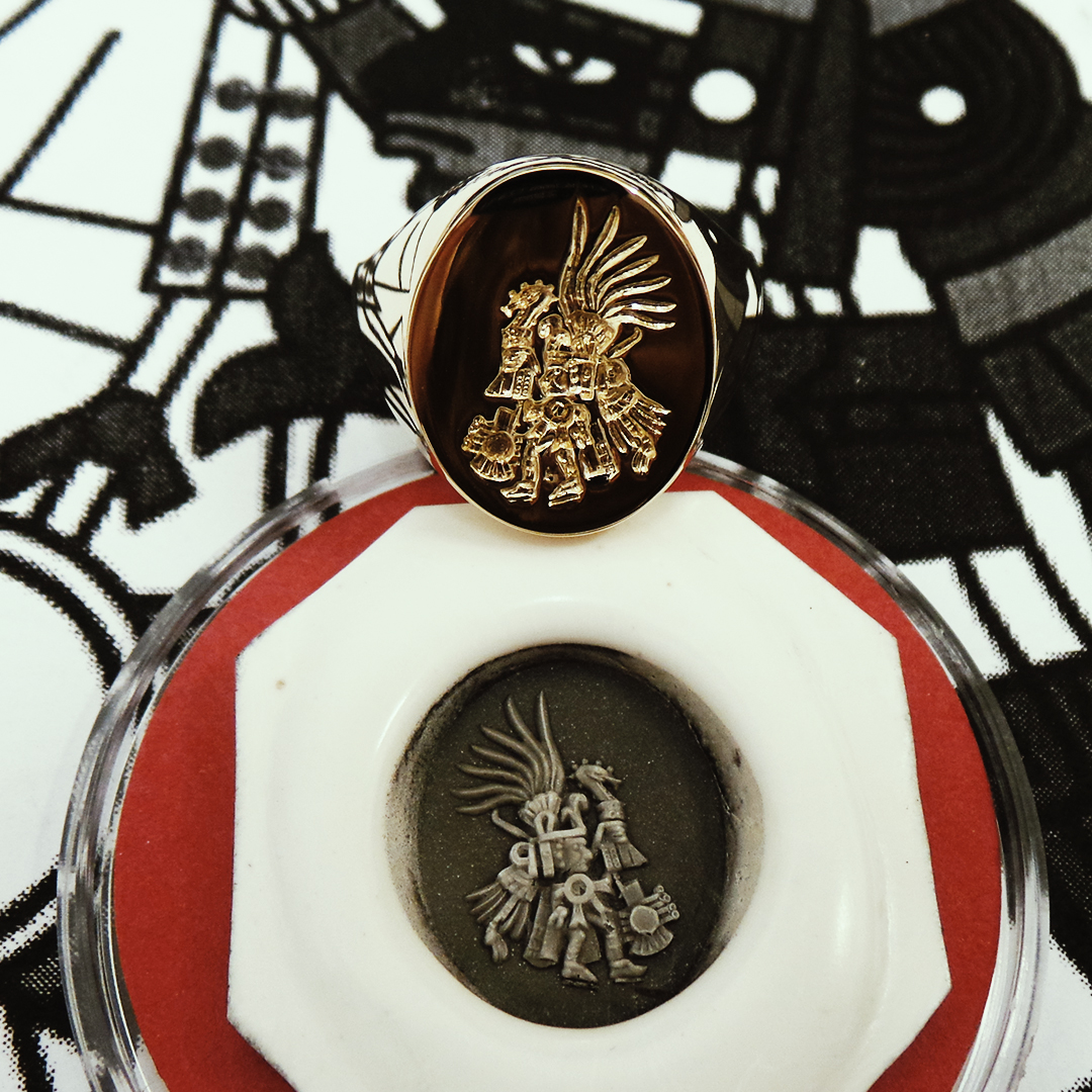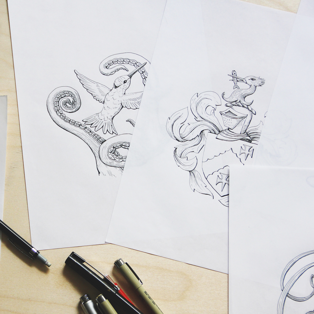 First I collect together additional reference materials relating to the brief to check any details, often including images and descriptions from specialist books and a trusty encyclopaedia. Then a quick sketch to check the composition works, fits the face of the ring and will look good when scaled down to the size of the ring. Then I get straight into drawing the finished design, often in pen. Whilst I draw, I think about the engraving process, I try to make sure that the marks made reflect the way engravers use their tools and imagine how the design will be worked into the metal.