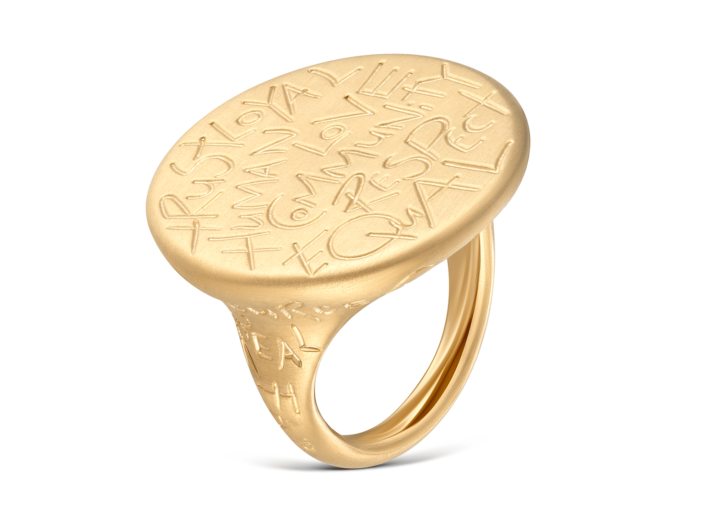 This hero piece brings together a wealth of cultural and historical inspirations from Ancient Greek and Roman jewellery through to the graffiti art of Jean Michel Basquiat, and is engraved with carefully curated words that evoke the power and respect of the SMO gold initiative; words that relate directly to the sustainable intention of direct mining.