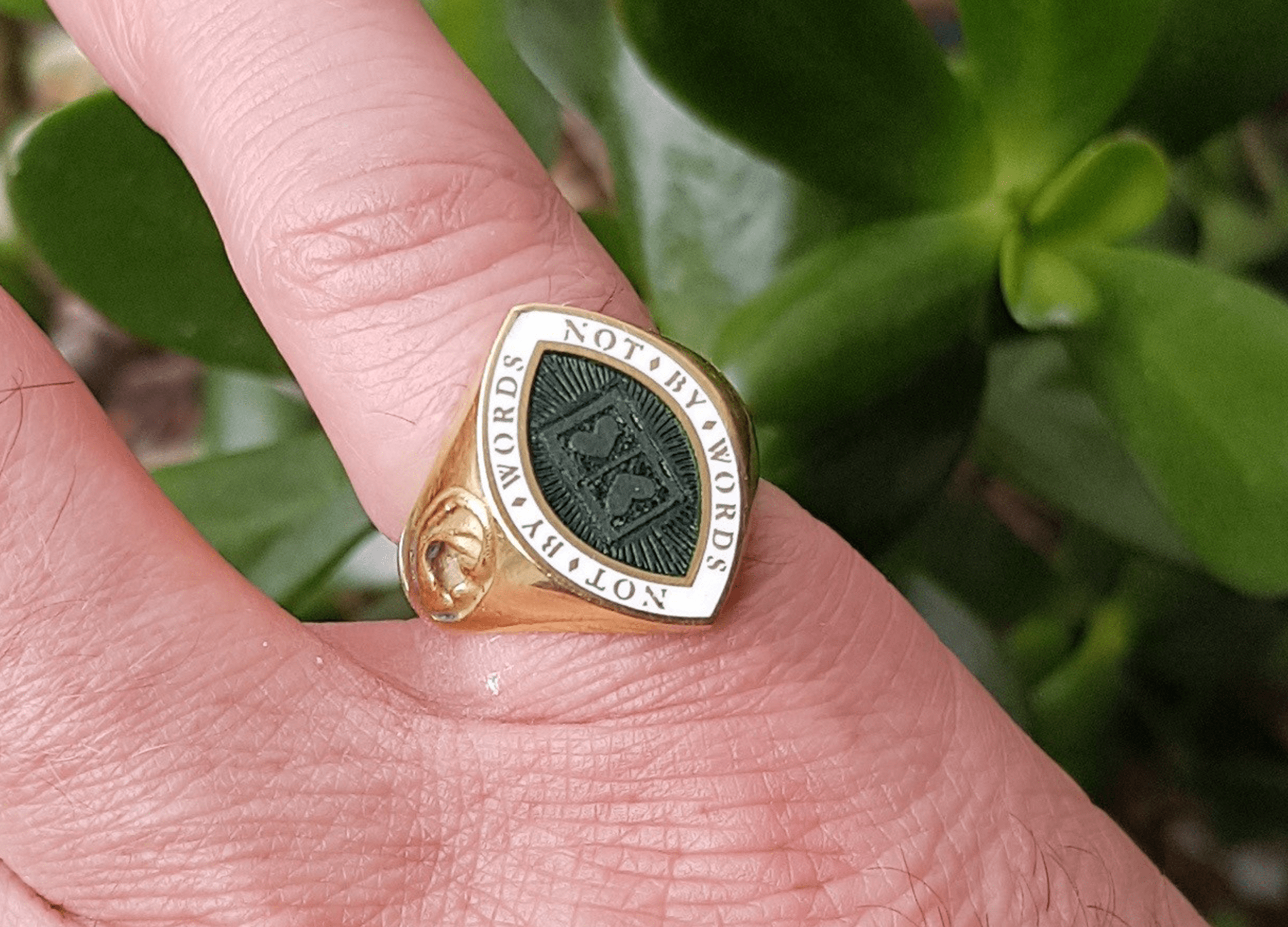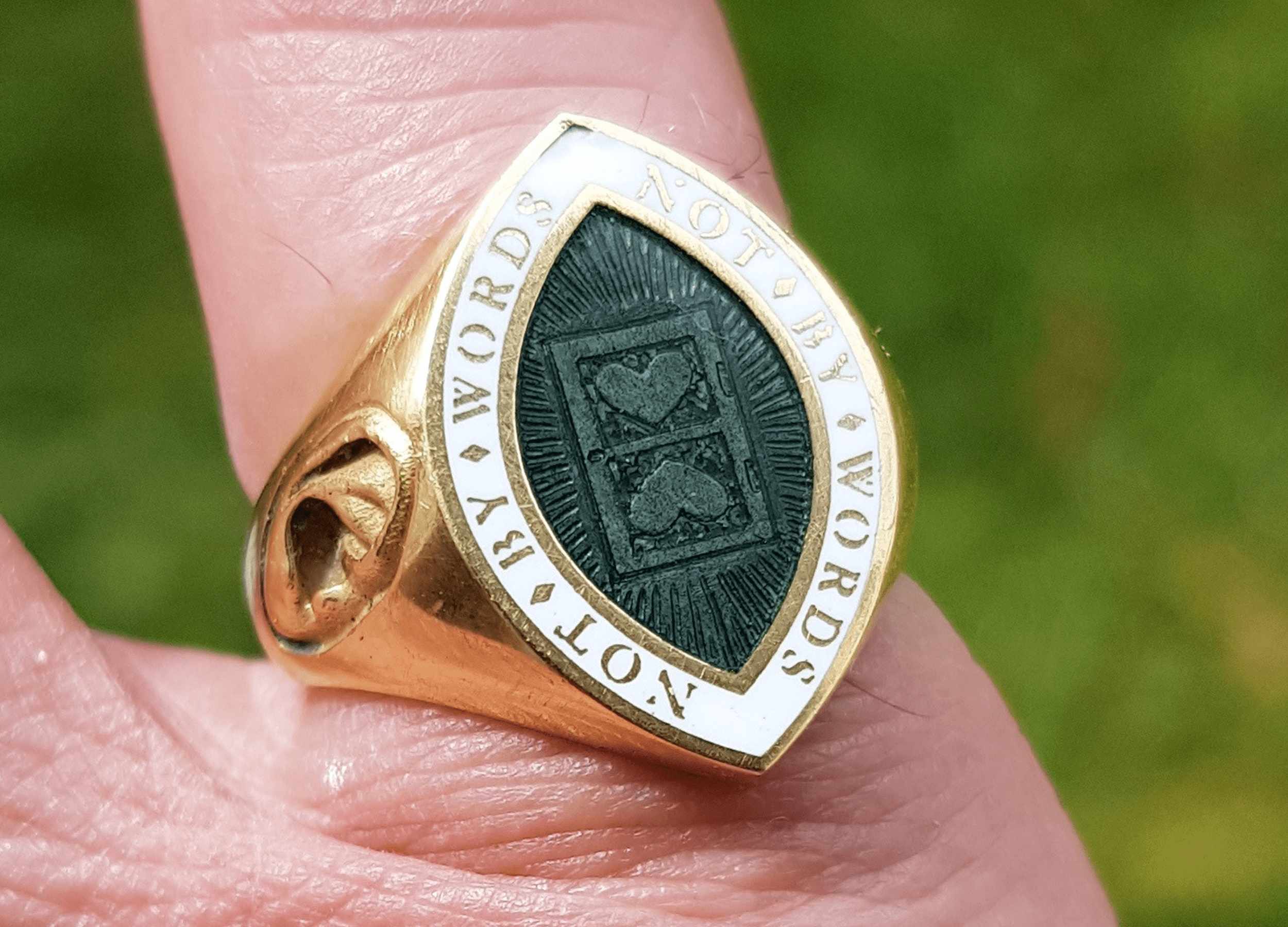 The dark green enamel in the centre of the ring is a nod to Philip’s proud Irish heritage. This colour choice offsets the white border, and has inadvertently created the appearance of an eye.
