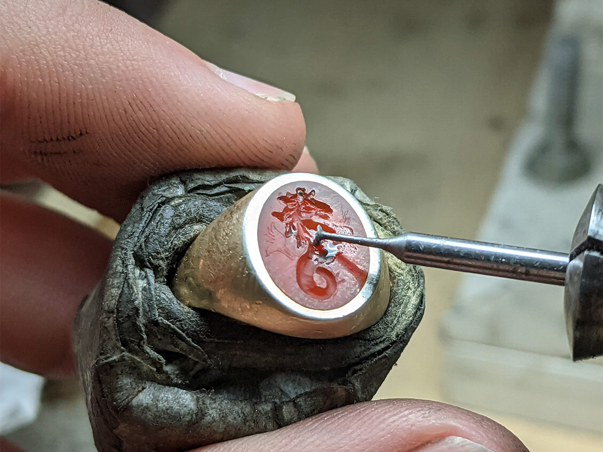 Seal engraving, otherwise known as ‘Intaglio’ is the craft of carving by hand your design into the precious metal or stone to effectively create miniature sculptures. Traditionally, the design is engraved in reverse into the ring, so that the wax impression taken from the seal engraving, shows an accurate 3D representation of your artwork. The Rebus craftsman must have the ability to think, draw and carve in reverse, in 3D. In miniature! It takes a great deal of ingenuity, where we often must make our own engraving tools for an individual job.