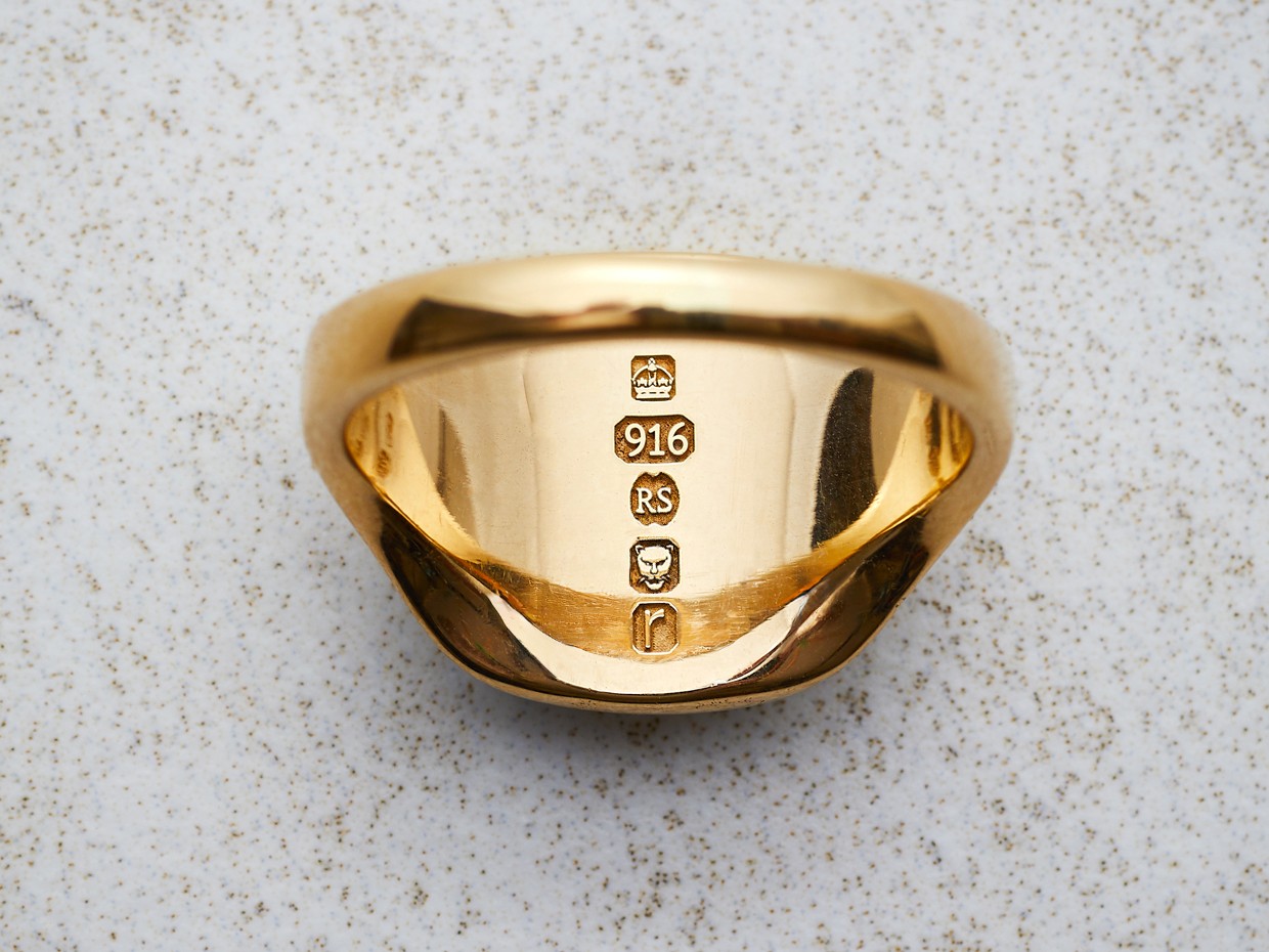 On request, we can create our iconic Rebus signet rings in yellow 22ct gold. Composed of 91.6% pure gold, 22ct is celebrated for its rich, radiant yellow hue and deep, vibrant colour. It’s high gold content gives it an unmistakable depth of colour, making it a popular choice for fine jewellery and traditional pieces. Due to its higher gold content, 22ct is softer than our other gold options and is best suited for those who do not subject their rings to heavy wear. When crafted with care, a 22ct gold signet ring captures the pure beauty of gold in its most luxurious form.