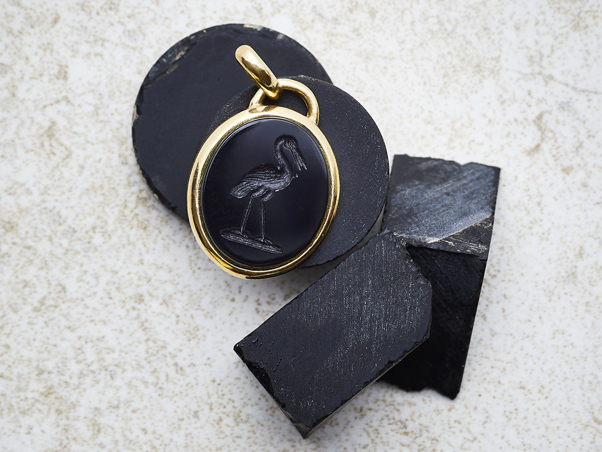 Use of Sardonyx appears in the art of Minoan Crete, notably from the archaeological recoveries at Knossos. Sardonyx comes in a wide range of natural colours and shades. The Sardonyx coloured bands are Sard (top layer), meaning colours other than the onyx (bottom layer), the combination of the two elements giving rise to its name. The colours we can offer in signet rings are petrol blue cutting through to black and creamy white cutting through to amber. The contrast between the stone layers once engraved makes for a striking seal engraving. These qualities made it a favourite with the ancient Romans, who believed that the virtue of stones could be increased if suitably engraved.
