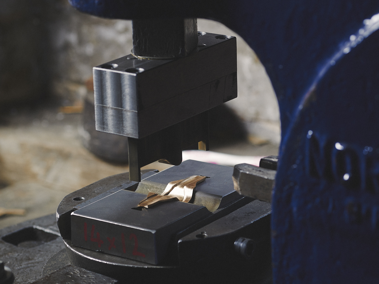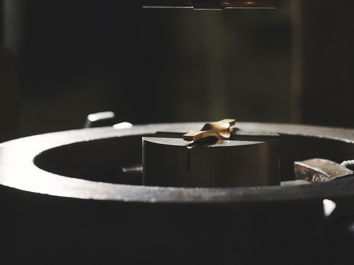 Once the rings have been blanked out from the precious metal sheet, they require forming to put the shape into the signet ring and finally put into a clipping tool to trim the excess gold. Each process requires different die tools and between each stage the signet ring requires annealing in a furnace at 800 degrees to soften the metal, in preparation for the next stage.