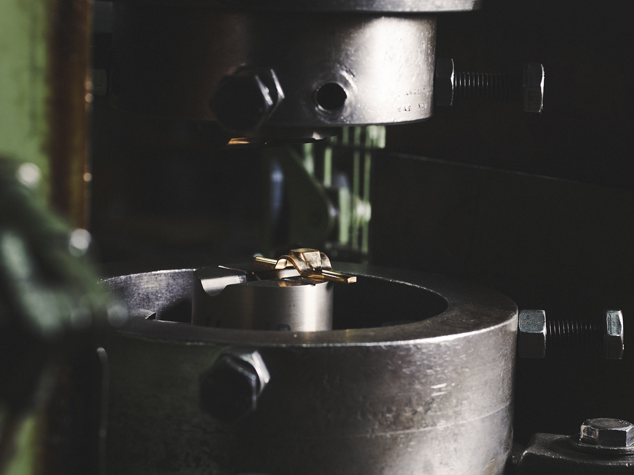 Die-stamped signet rings begin with a sheet of highly compressed precious metal. This is carefully fed into a hydraulic press that houses our specially shaped steel dies which strike the thick, precious metal sheet with 70 tons PSI of pressure to blank out a flat signet ring shape. This process compresses the metal even further, giving the rings density and longevity they require to last a lifetime.