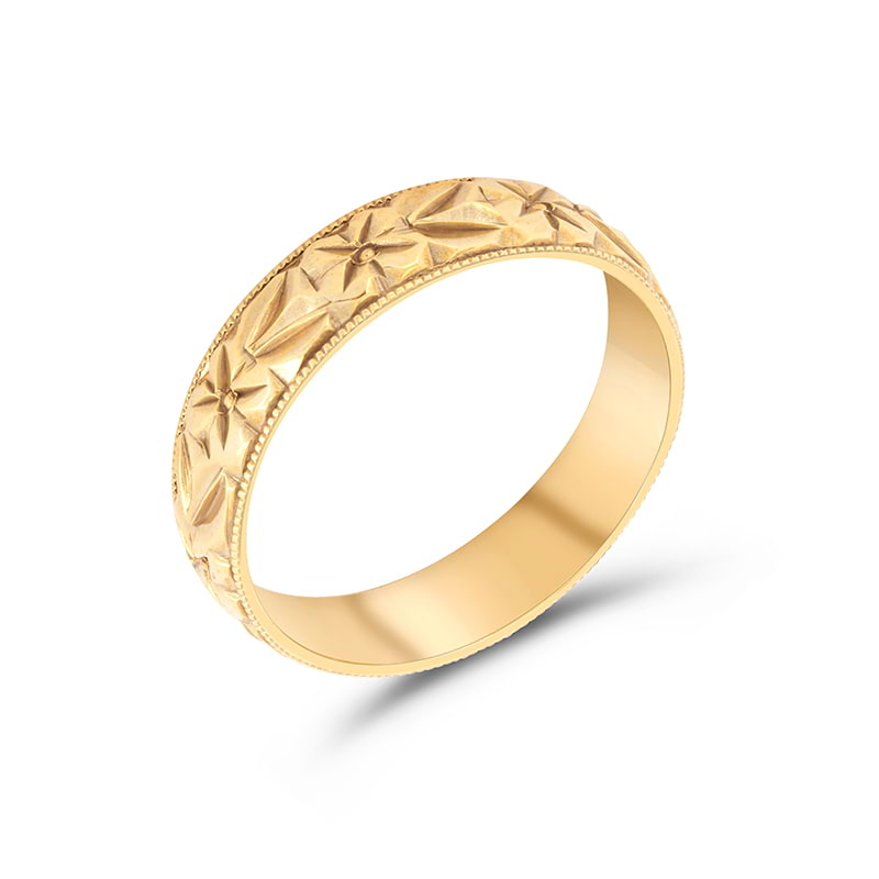 Our team of hand engravers can also deep carve patterns running around the outside of the bands, with our signature Laurel and Orange Blossom designs as options.